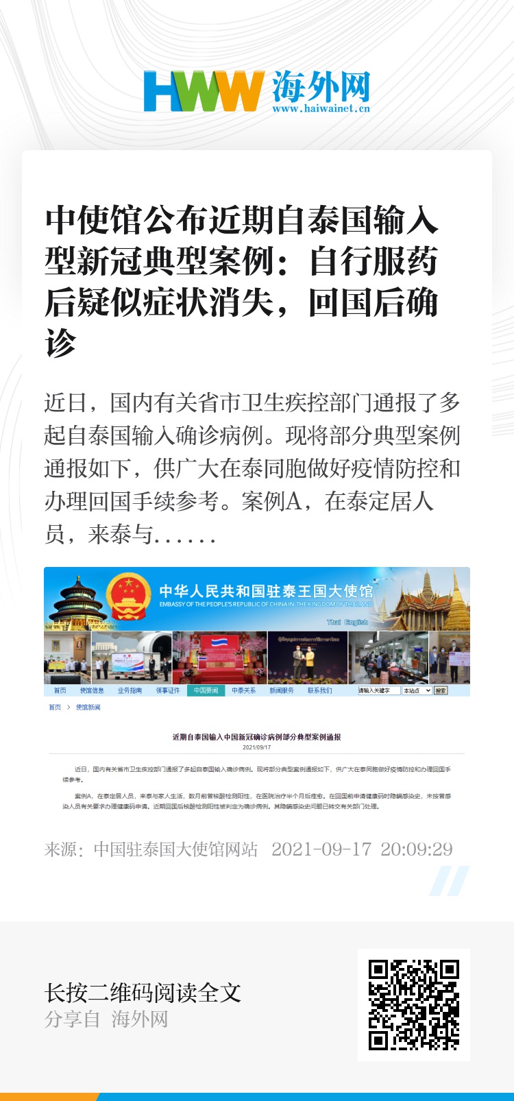 近日,国内有关省市卫生疾控部门通报了多起自泰国输入确诊病例。现将部分典型案例通报如下,供广大在泰同胞做好疫情防控和办理回国手续参考。