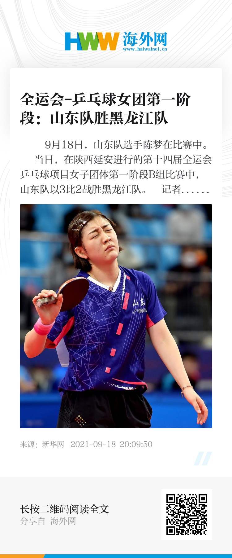当日,在陕西延安进行的第十四届全运会乒乓球项目女子团体第一阶段B组比赛中,山东队以3比2战胜黑龙江队。