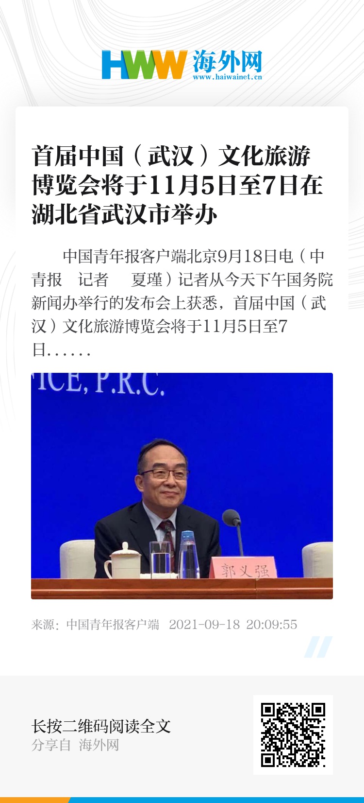 中国青年报客户端北京9月18日电(中青报・中青网记者 夏瑾)记者从今天下午国务院新闻办举行的发布会上获悉,首届中国(武汉)文化旅游博览会将于11月5日至7日在湖北省武汉市举办。