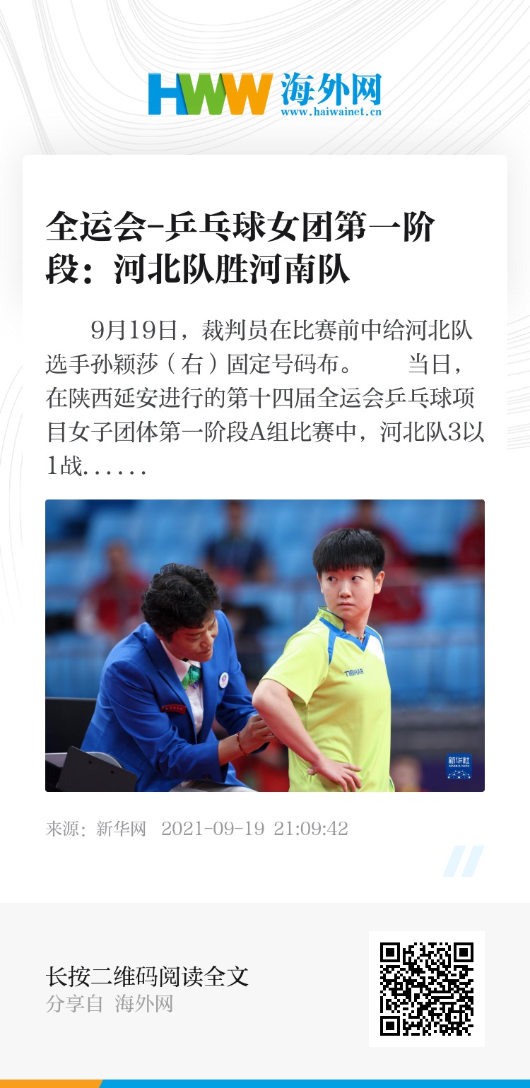 当日,在陕西延安进行的第十四届全运会乒乓球项目女子团体第一阶段A组比赛中,河北队3以1战胜河南队。