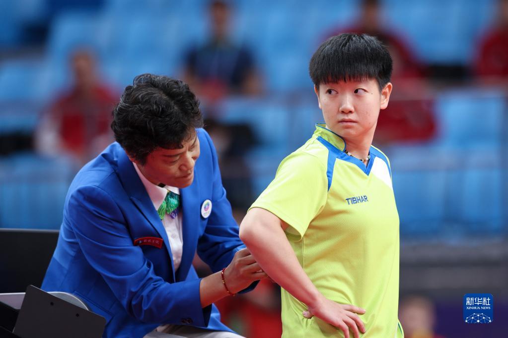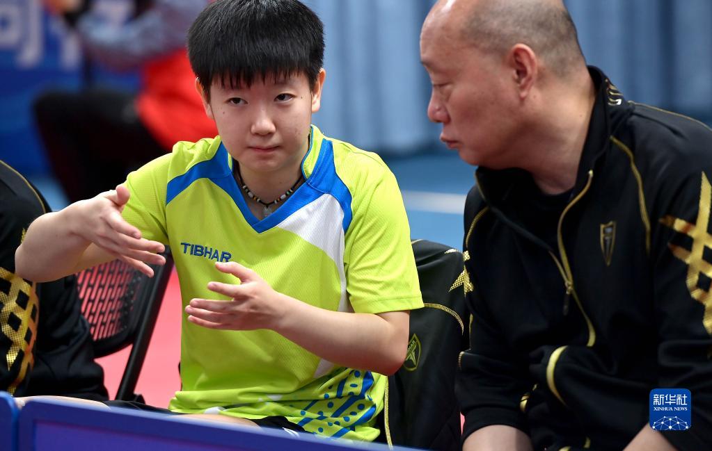 9月19日,河北队选手孙颖莎(左)在比赛后和教练交流。