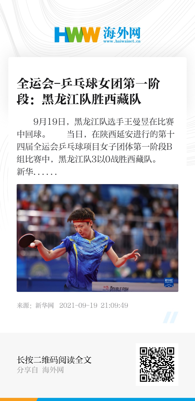 当日,在陕西延安进行的第十四届全运会乒乓球项目女子团体第一阶段B组比赛中,黑龙江队3以0战胜西藏队。
