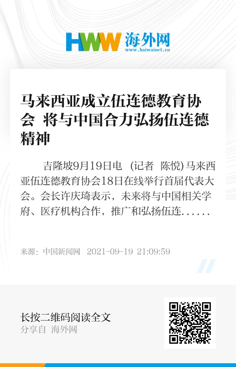 中新网吉隆坡9月19日电 (记者 陈悦)马来西亚伍连德教育协会18日在线举行首届代表大会。会长许庆琦表示,未来将与中国相关学府、医疗机构合作,推广和弘扬伍连德精神。