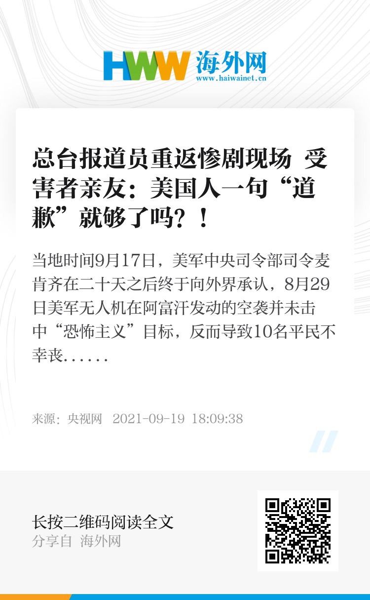 受害者的侄子马苏德愤怒地向总台报道员表示,犯下这样错误的人绝对不能因为“道歉”就逃脱法律的制裁,特别是美国口口声声对外宣称保护人权,却用自己的高科技手段操纵着毫无人性的战争机器,这样的行为在国际法中是赤裸裸的犯罪。