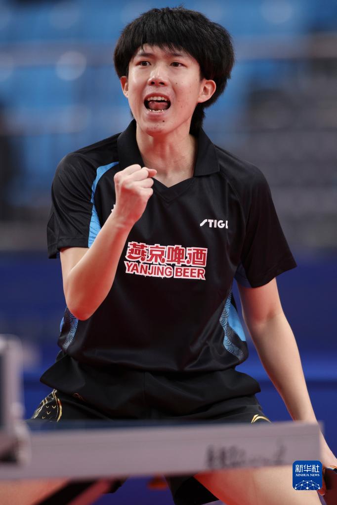 9月20日,北京队选手王楚钦在比赛中庆祝得分。