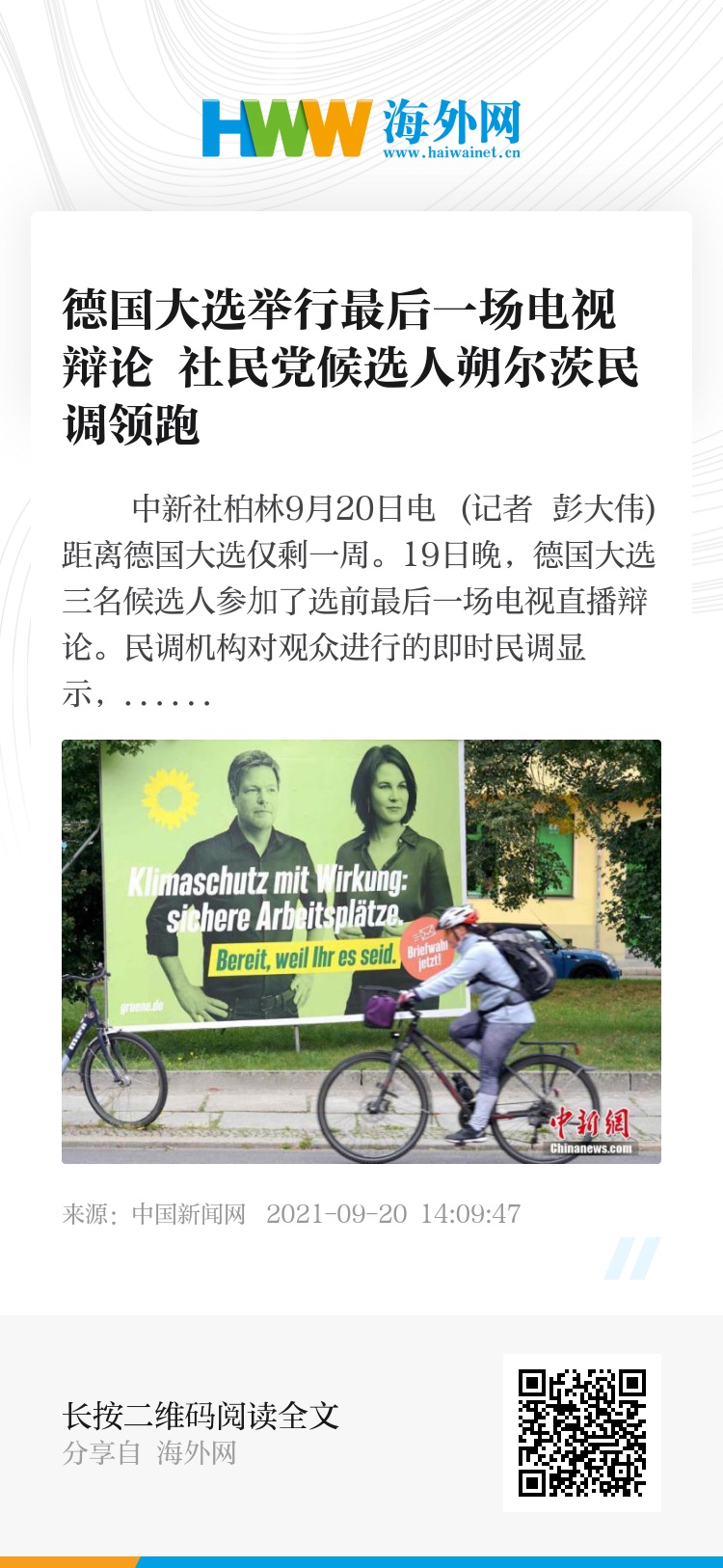 中新社柏林9月20日电 (记者 彭大伟)距离德国大选仅剩一周。19日晚,德国大选三名候选人参加了选前最后一场电视直播辩论。民调机构对观众进行的即时民调显示,社民党候选人朔尔茨维持前两场辩论后的优势,以42%的支持率大幅领先基民盟的拉舍特(27%)和绿党的贝尔伯克(25%)。