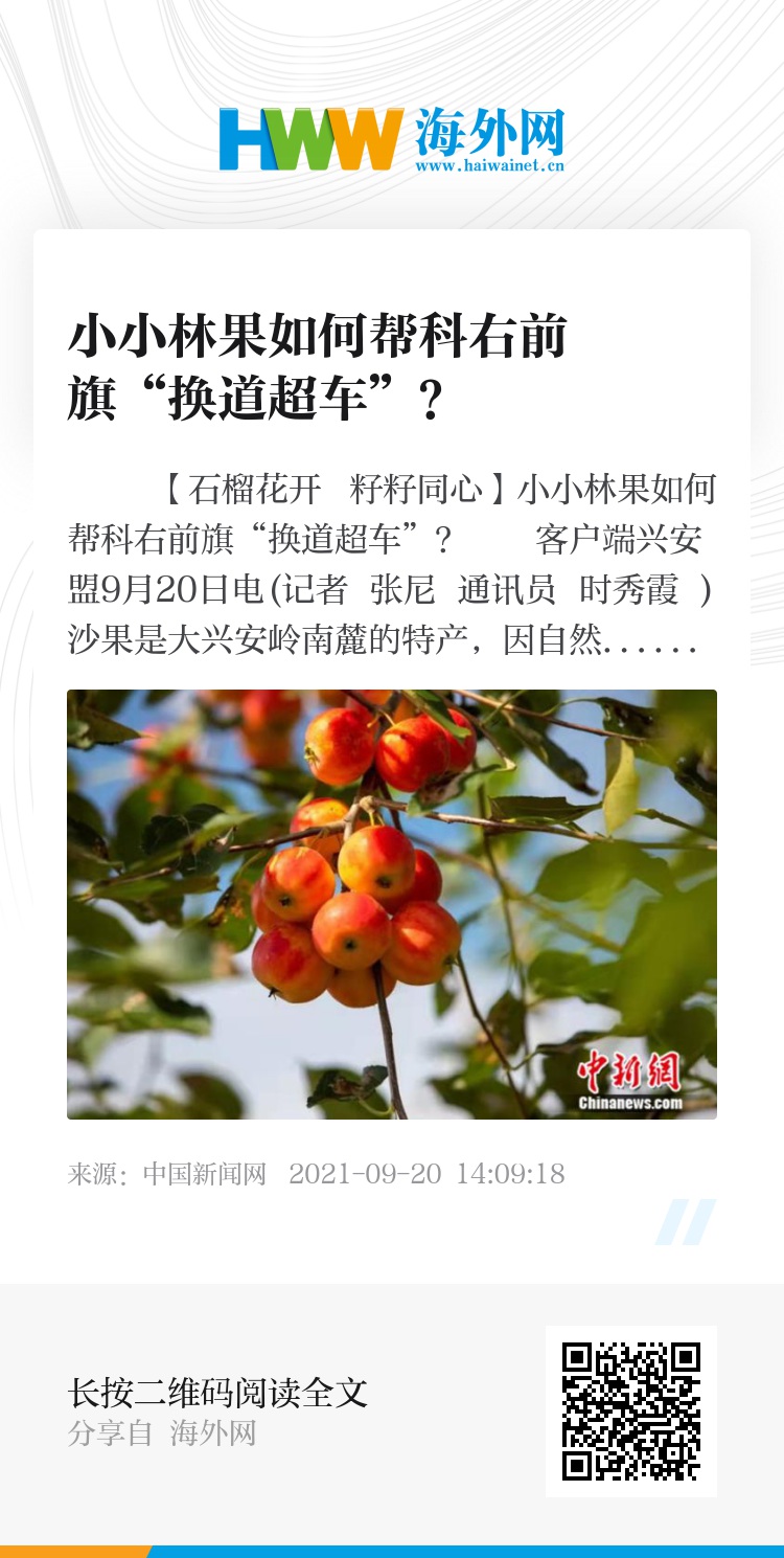 中新网客户端兴安盟9月20日电(记者 张尼 通讯员 时秀霞 )沙果是大兴安岭南麓的特产,因自然条件和气候条件独特,内蒙古兴安盟科尔沁右翼前旗所产沙果营养美味。也正是这样一颗小小的果子,帮当地不少老百姓实现了脱贫致富。