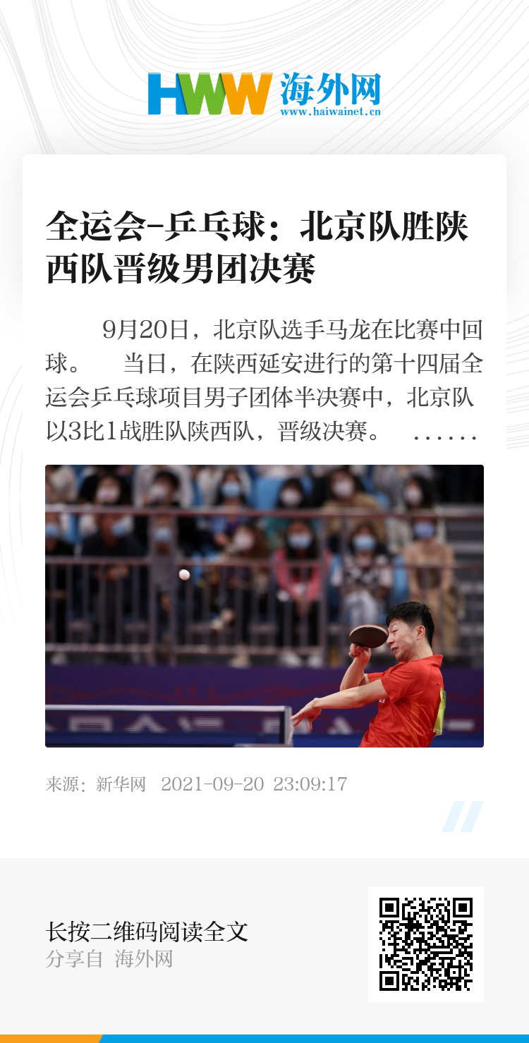 当日,在陕西延安进行的第十四届全运会乒乓球项目男子团体半决赛中,北京队以3比1战胜队陕西队,晋级决赛。