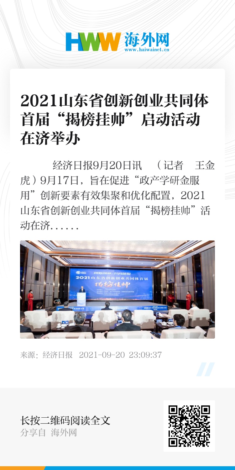 经济日报9月20日讯 (记者 王金虎)9月17日,旨在促进“政产学研金服用”创新要素有效集聚和优化配置,2021山东省创新创业共同体首届“揭榜挂帅”活动在济南启动。