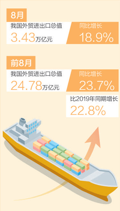 海关总署最近发布数据显示,8月份,我国外贸进出口总值3.43万亿元,同比增长18.9%,连续15个月实现同比正增长,进一步呈现稳中加固态势。前8个月,我国外贸进出口总值24.78万亿元,同比增长23.7%,比2019年同期增长22.8%。