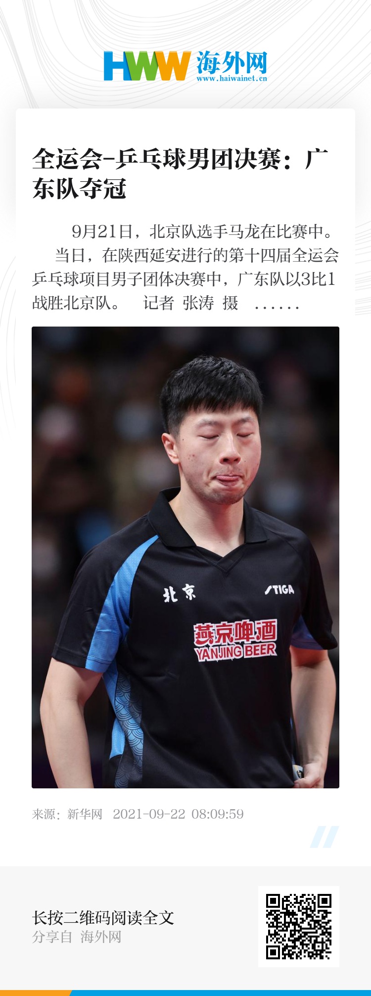当日,在陕西延安进行的第十四届全运会乒乓球项目男子团体决赛中,广东队以3比1战胜北京队。