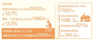 吴玉韶介绍,第七次全国人口普查数据显示,我国60岁及以上人口为26402万人,占总人口的18.7%,其中65岁及以上人口为19064万人,占总人口的13.5%。养老消费由生活必需型向发展型、参与型、享受型转变。越来越多的老年人愿意在培养兴趣爱好、陶冶情操上加大投入,老年教育市场潜力巨大。