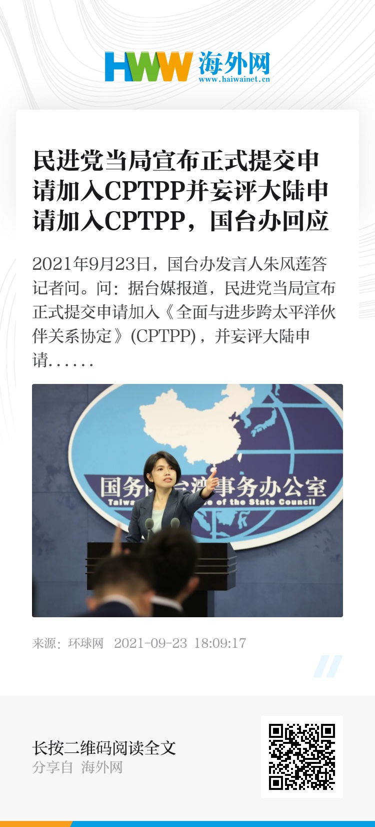 问:据台媒报道,民进党当局宣布正式提交申请加入《全面与进步跨太平洋伙伴关系协定》(CPTPP),并妄评大陆申请加入CPTPP。对此有何评论?