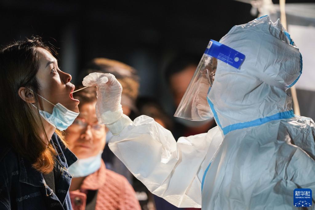 9月22日晚,在哈尔滨市新乡里社区核酸检测点,医护人员为居民进行核酸检测取样。新华社记者 王松 摄