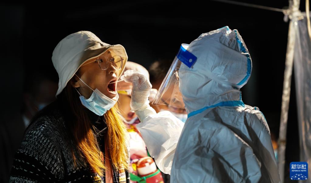 9月22日晚,在哈尔滨市新乡里社区核酸检测点,医护人员为居民进行核酸检测取样。新华社记者 王松 摄