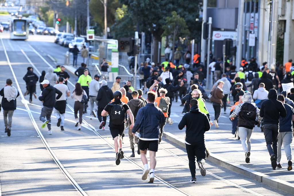 当地时间2021年9月22日,澳大利亚墨尔本,当地爆发反封锁抗议活动,示威者与警方激烈冲突。图源:澎湃影像