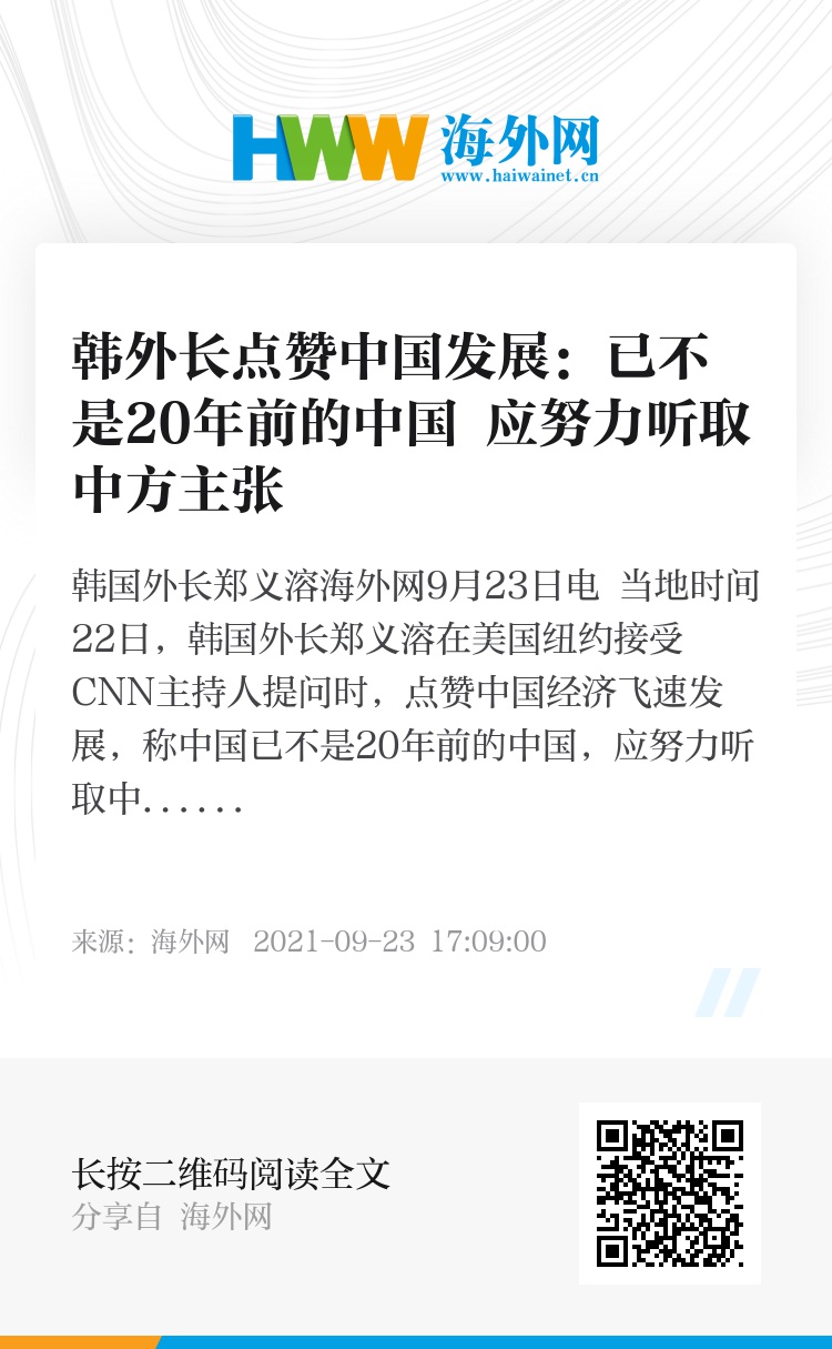 海外网9月23日电 当地时间22日,韩国外长郑义溶在美国纽约接受CNN主持人提问时,点赞中国经济飞速发展,称中国已不是20年前的中国,应努力听取中方主张。