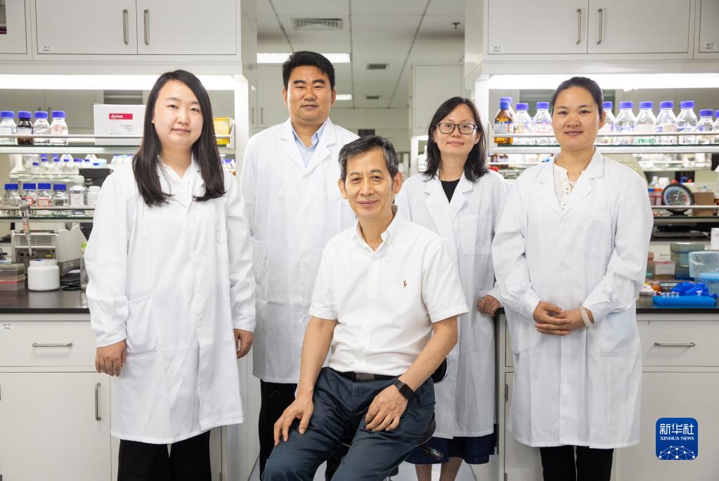 科研团队乔婧科研助理、蔡韬副研究员、马延和研究员、朱蕾蕾研究员、孙红兵科研助理(从左至右)在中国科学院天津工业生物技术研究所实验室合影(9月16日摄)。新华社记者 金立旺 摄