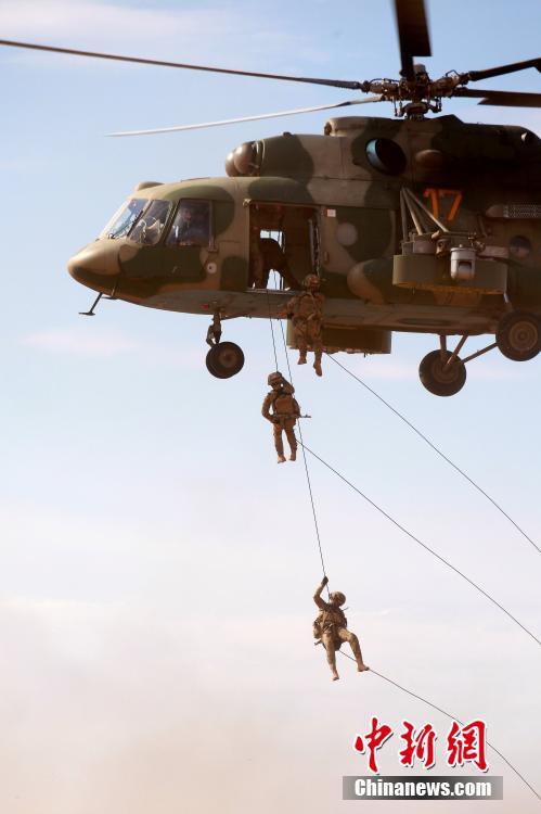 当地时间9月23日,“和平使命-2021”上合组织联合反恐军事演习实施实兵行动。图为特战队员从直升机索降。 中新社记者 李纯 摄
