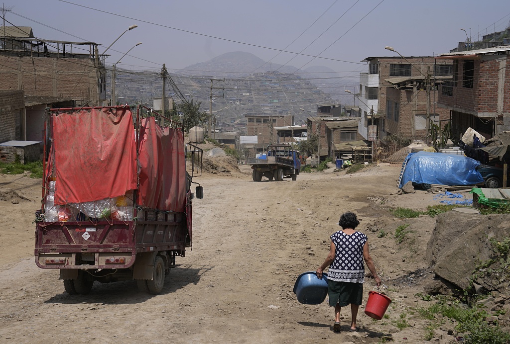 图为秘鲁利马Villa Maria棚户区,一名妇女步行去取水。图片来源:视觉中国