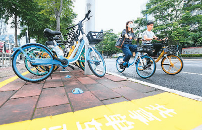 福州市区共享单车驿站启用“蓝牙道钉”装置,与安装在共享单车上的北斗卫星高精度分体锁通信,实现单车无桩式定点停放。新华社记者 林善传摄