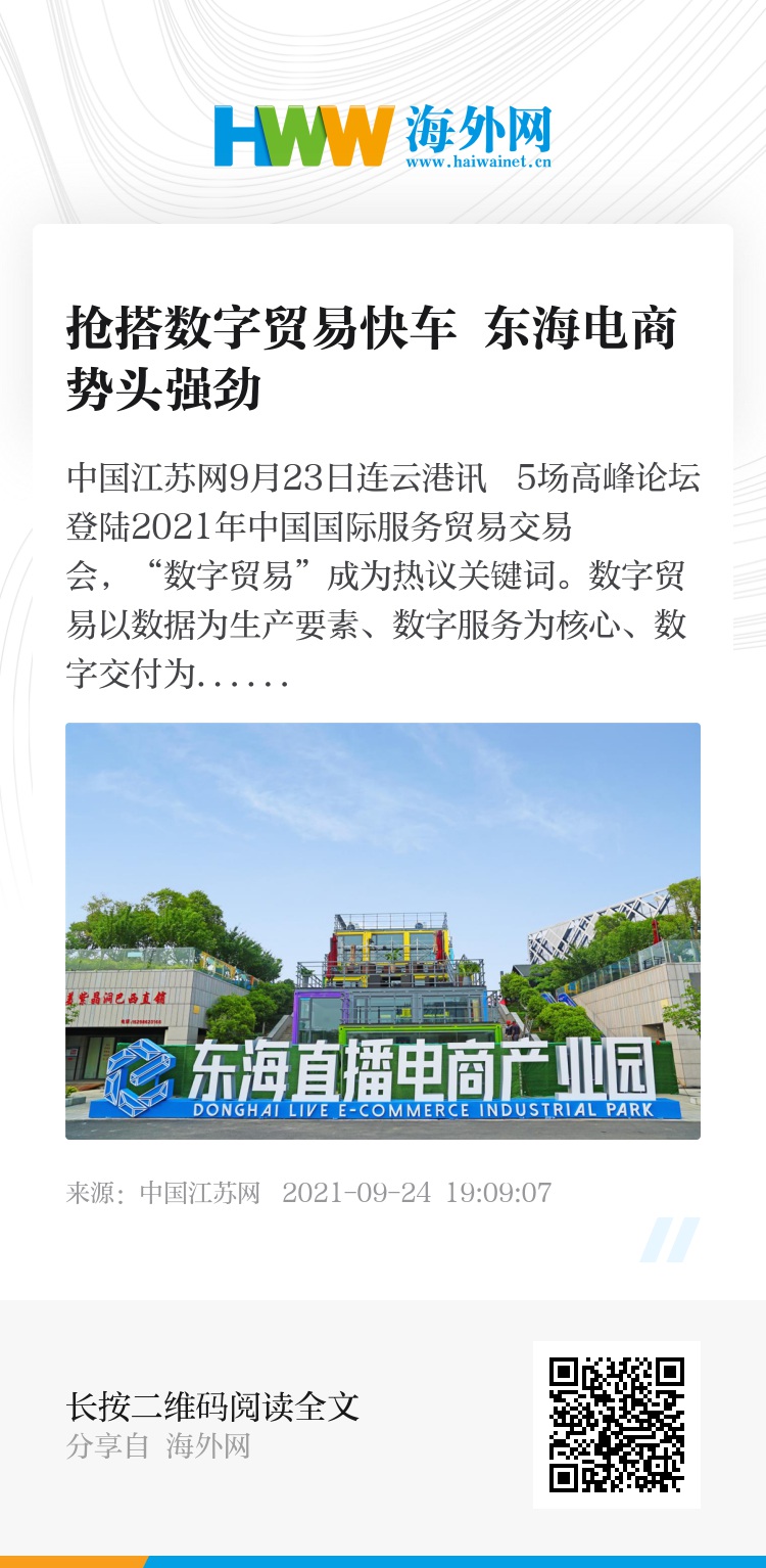 中国江苏网9月23日连云港讯 5场高峰论坛登陆2021年中国国际服务贸易交易会,“数字贸易”成为热议关键词。数字贸易以数据为生产要素、数字服务为核心、数字交付为特征,电子商务是其中的重要内容。依托深厚的电子商务基础,巧搭数字贸易快车,东海县逐浪起舞。