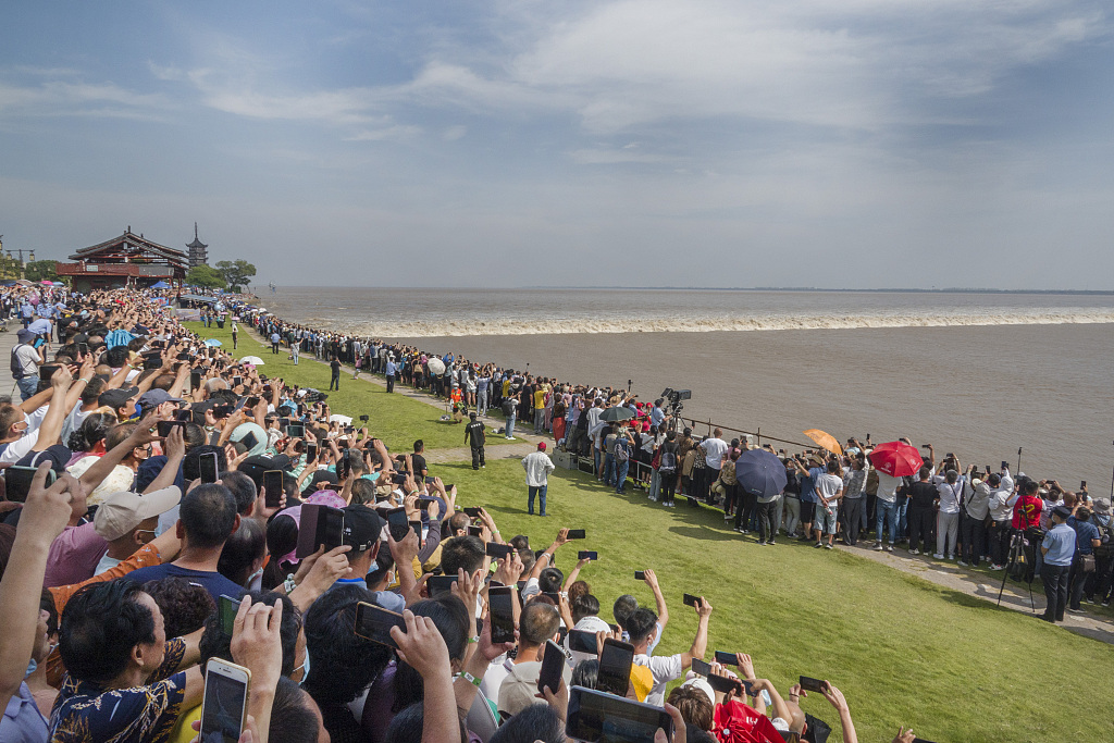 9月24日,钱塘江海宁段,数百里海塘上成千上万的观潮游客慕名而来,争睹这一自然界奇观。 图片作者:签约供稿人/视觉中国