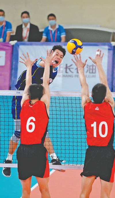 9月24日,十四运会男排20岁以下组决赛举行,山东队以3∶2战胜浙江队夺冠。图为山东队球员池芳旭(后)在比赛中扣球。