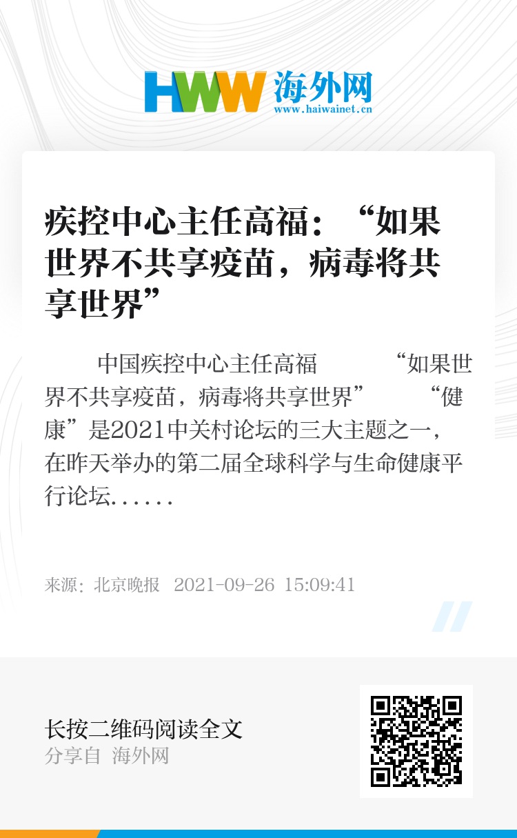 “健康”是2021中关村论坛的三大主题之一,在昨天举办的第二届全球科学与生命健康平行论坛上,中国科学院院士、中国疾病预防控制中心主任高福表示,确保所有国家都能获得和大规模使用新冠疫苗,是防止新冠病毒在全世界传播的一项重要战略。“如果世界不共享疫苗,病毒将共享世界。”