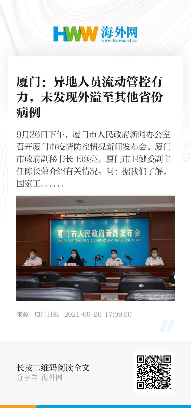 9月26日下午,厦门市人民政府新闻办公室召开厦门市疫情防控情况新闻发布会。厦门市政府副秘书长王庭亮,厦门市卫健委副主任陈长荣介绍有关情况。