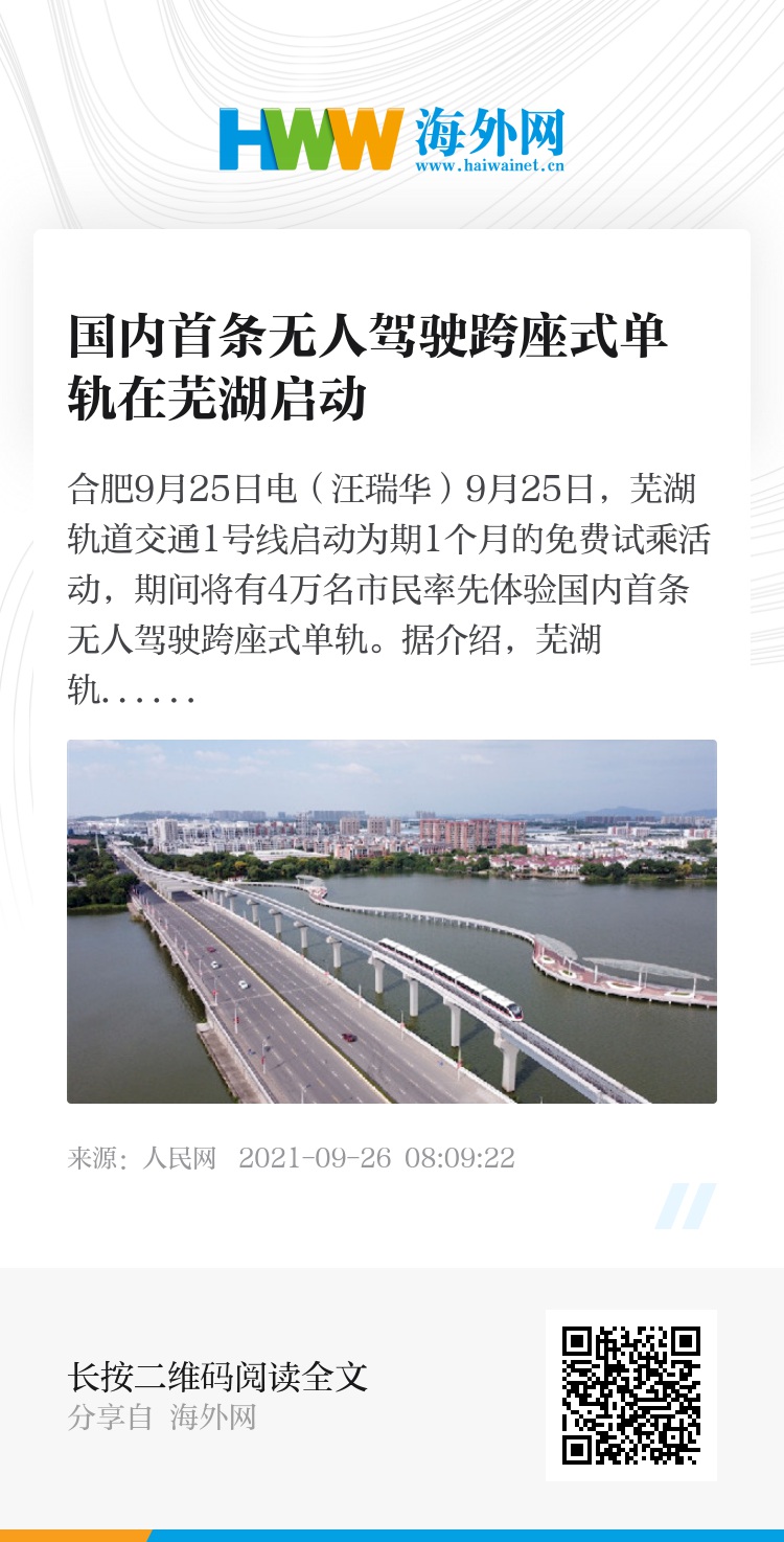 人民网合肥9月25日电(汪瑞华)9月25日,芜湖轨道交通1号线启动为期1个月的免费试乘活动,期间将有4万名市民率先体验国内首条无人驾驶跨座式单轨。
