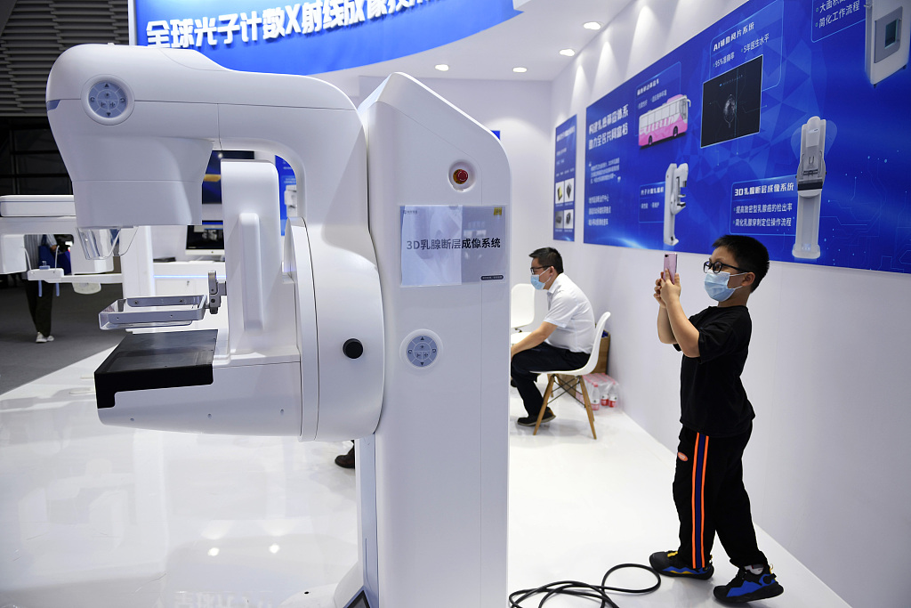 2021年9月25日,浙江乌镇,一款3D断层成像设备吸引小朋友拍照。作为2021年世界互联网大会乌镇峰会的组成部分,“互联网之光”博览会25日在浙江桐乡的乌镇启幕。 中新社记者 许少峰 摄