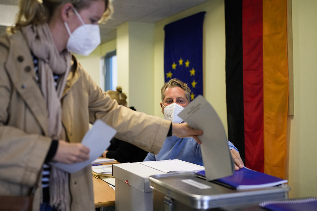 当地时间2021年9月26日,德国柏林民众前往投票站参加议会选举投票。四年一度的德国联邦议院选举于9月26日举行,新一届德国政府将基于选举结果组建。图片来源:人民视觉