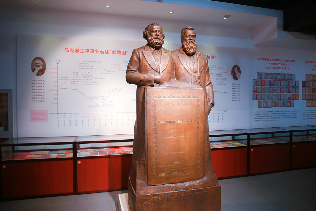 2021年9月23日,上海青浦东方绿舟国防教育基地《红色之源:马恩经典与党建核心文献》上海首展举办。2700多种版本的马克思、恩格斯所著《共产党宣言》、220种《中国共产党党章》珍品与观众见面。展品还包括全球唯一发现的《共产党宣言》马克思签名本珍贵藏品、马克思恩格斯雕像及相关图片史料。图片来源:人民视觉