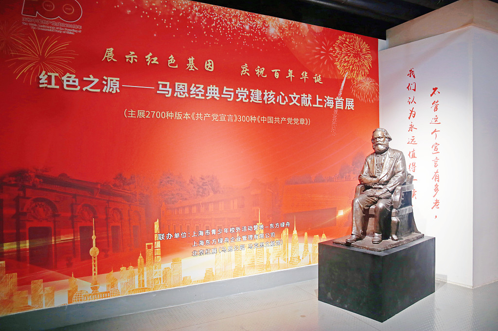 2021年9月23日,上海青浦东方绿舟国防教育基地《红色之源:马恩经典与党建核心文献》上海首展举办。2700多种版本的马克思、恩格斯所著《共产党宣言》、220种《中国共产党党章》珍品与观众见面。展品还包括全球唯一发现的《共产党宣言》马克思签名本珍贵藏品、马克思恩格斯雕像及相关图片史料。图片来源:人民视觉