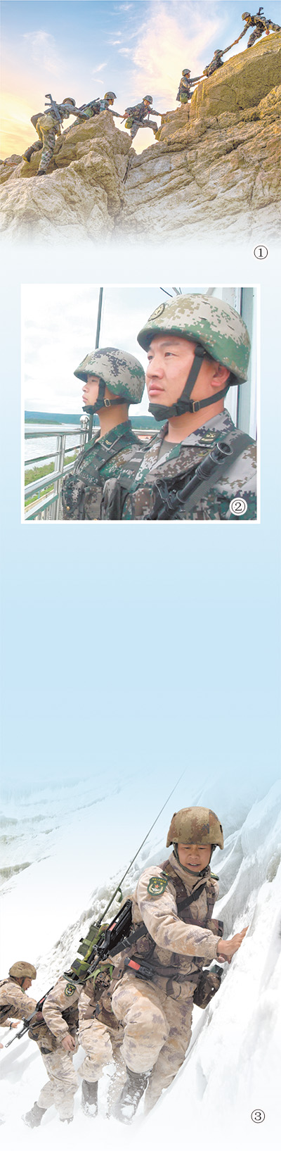 图③:“高原戍边模范营”某观察哨官兵正在冰川上巡逻。