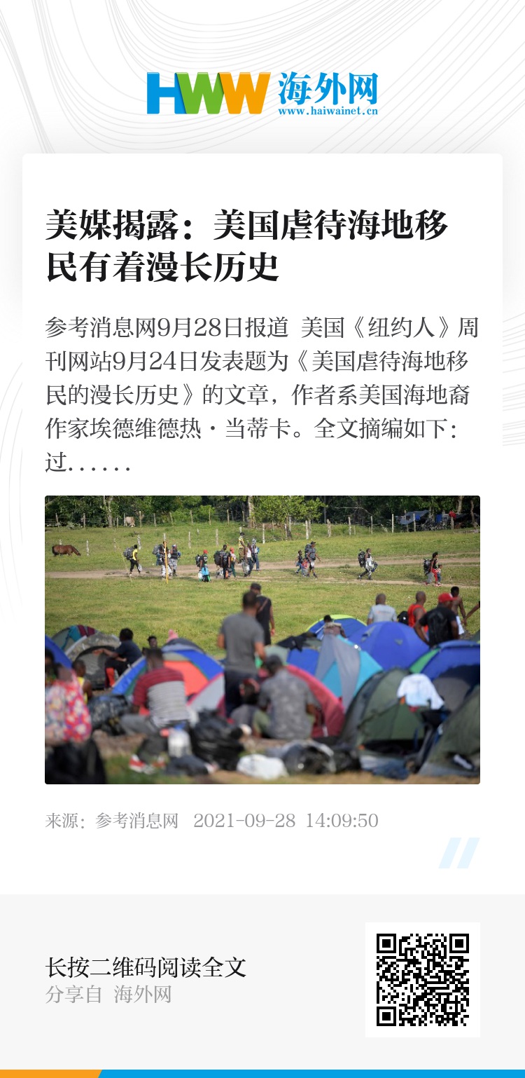 参考消息网9月28日报道 美国《纽约人》周刊网站9月24日发表题为《美国虐待海地移民的漫长历史》的文章,作者系美国海地裔作家埃德维德热·当蒂卡。全文摘编如下: