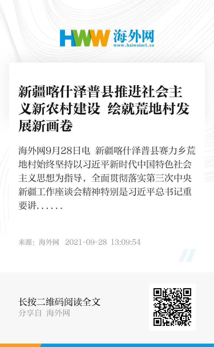 海外网9月28日电 新疆喀什泽普县赛力乡荒地村始终坚持以习近平新时代中国特色社会主义思想为指导,全面贯彻落实第三次中央新疆工作座谈会精神特别是习近平总书记重要讲话精神,以实施乡村振兴战略为总抓手,按照产业兴旺、生态宜居、乡风文明、治理有效、生活富裕的总要求,全力推进社会主义新农村建设,绘就荒地村发展新画卷。