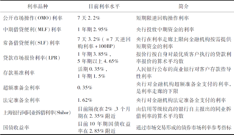 (一)公开市场操作(OMO)利率与利率走廊。公开市场操作7天期逆回购利率是央行短期政策利率,目前利率水平为2.2%。央行通过每日开展公开市场操作,保持银行体系流动性合理充裕,持续释放短期政策利率信号,使存款类金融机构质押式回购利率(DR)等短期市场利率围绕政策利率为中枢波动,并向其他市场利率传导。同时,通过以常备借贷便利(SLF)利率为上限、超额准备金利率为下限的利率走廊的辅助,将短期利率的波动限制在合理范围。其中,SLF是央行按需向金融机构提供短期资金的工具,由于金融机构可按SLF利率从央行获得资金,就不必以高于SLF利率的价格从市场融入资金,因此SLF利率可视为利率走廊的上限。目前7天期SLF利率为3.2%,也就是7天期公开市场逆回购利率加100个基点。近期,人民银行推动SLF电子化操作方式改革,有序实现全流程电子化,有利于提高操作效率,稳定市场预期,增强银行体系流动性的稳定性,维护货币市场利率平稳运行,有效防范流动性风险。超额准备金利率是央行对金融机构存放在央行的超额准备金付息的利率,由于金融机构总是可以将剩余资金放入超额准备金账户,并获得超额准备金利率,就不会有机构愿意以低于超额准备金利率的价格向市场融出资金,因此超额准备金利率可视为利率走廊的下限。目前超额准备金利率为0.35%。