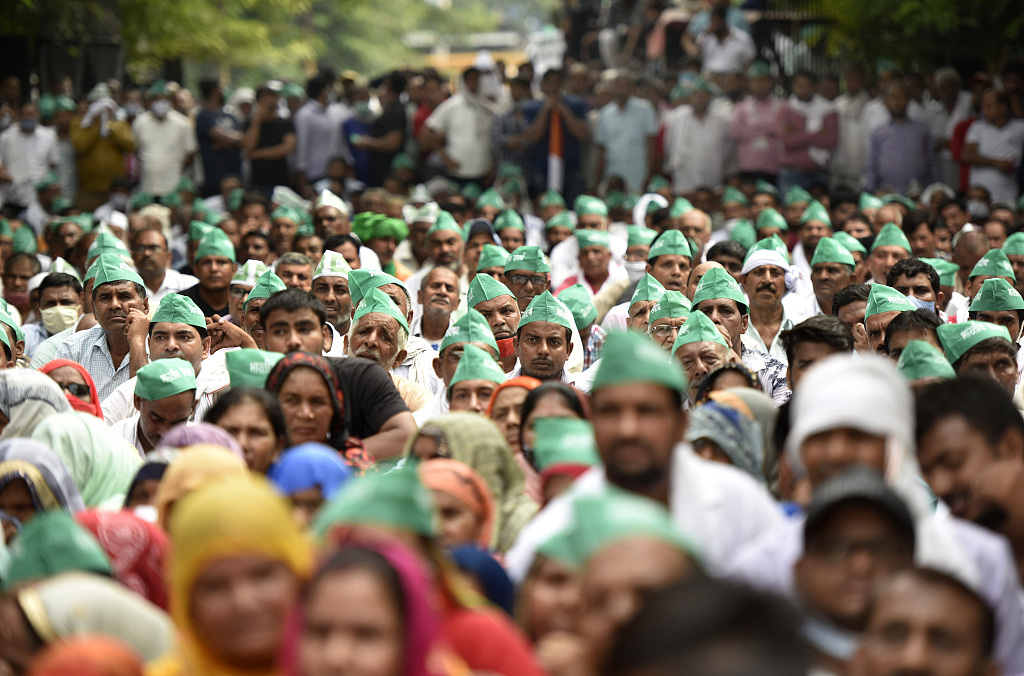 当地时间9月27日,印度新农业法通过一周年之际,印度农民组织发起了抗议活动,各地40多个农民工会的农民封锁了多条高速公路和铁路。据印度亚洲通讯社报道,农民组织呼吁抗议活动从早上6点持续到下午4点。图片来源:人民视觉