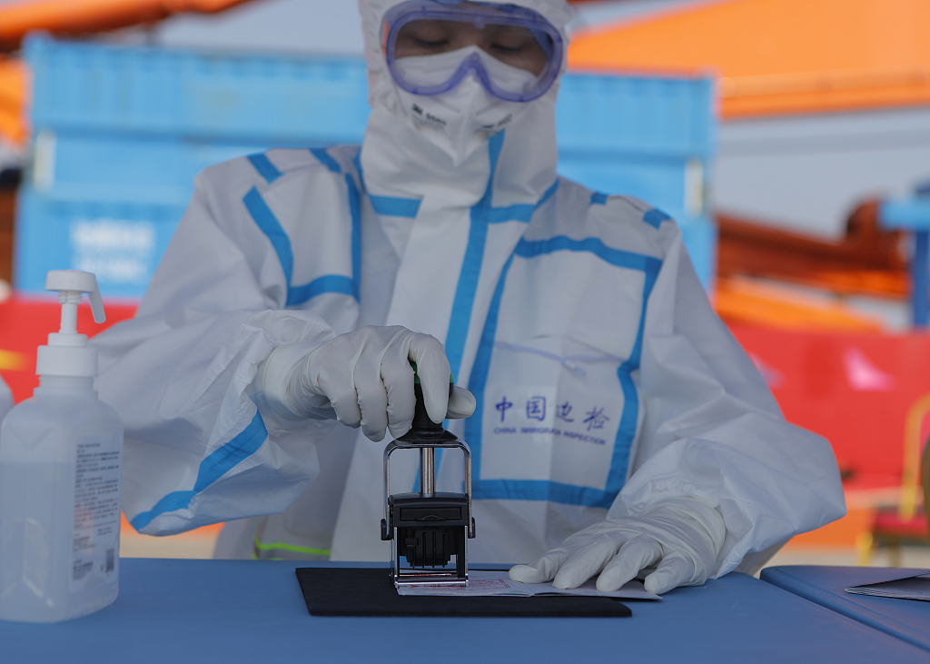 2021年9月27日11时,国产“雪龙2”号科考破冰船圆满完成中国第12次北极科学考察任务顺利返航,靠泊在上海外高桥的中国极地科考国内基地码头。上海边检总站外高桥边检站将入境查验点前置至码头,靠前“一站式”办理船舶和人员入境边检手续,让“雪龙2”号快速回到祖国怀抱。图片来源:人民视觉