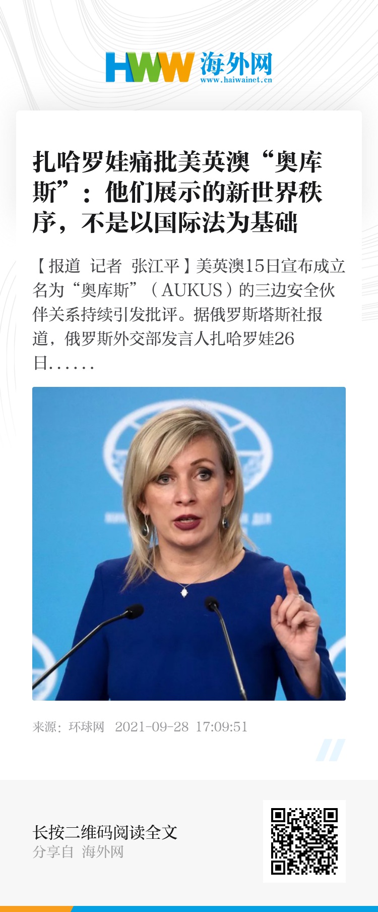 【环球网报道 记者 张江平】美英澳15日宣布成立名为“奥库斯”(AUKUS)的三边安全伙伴关系持续引发批评。据俄罗斯塔斯社报道,俄罗斯外交部发言人扎哈罗娃26日在一档节目中说,美英澳三边安全伙伴关系显然向西方展示了基于新捏造的规则的世界秩序,这种世界秩序不是以国际法为基础。
