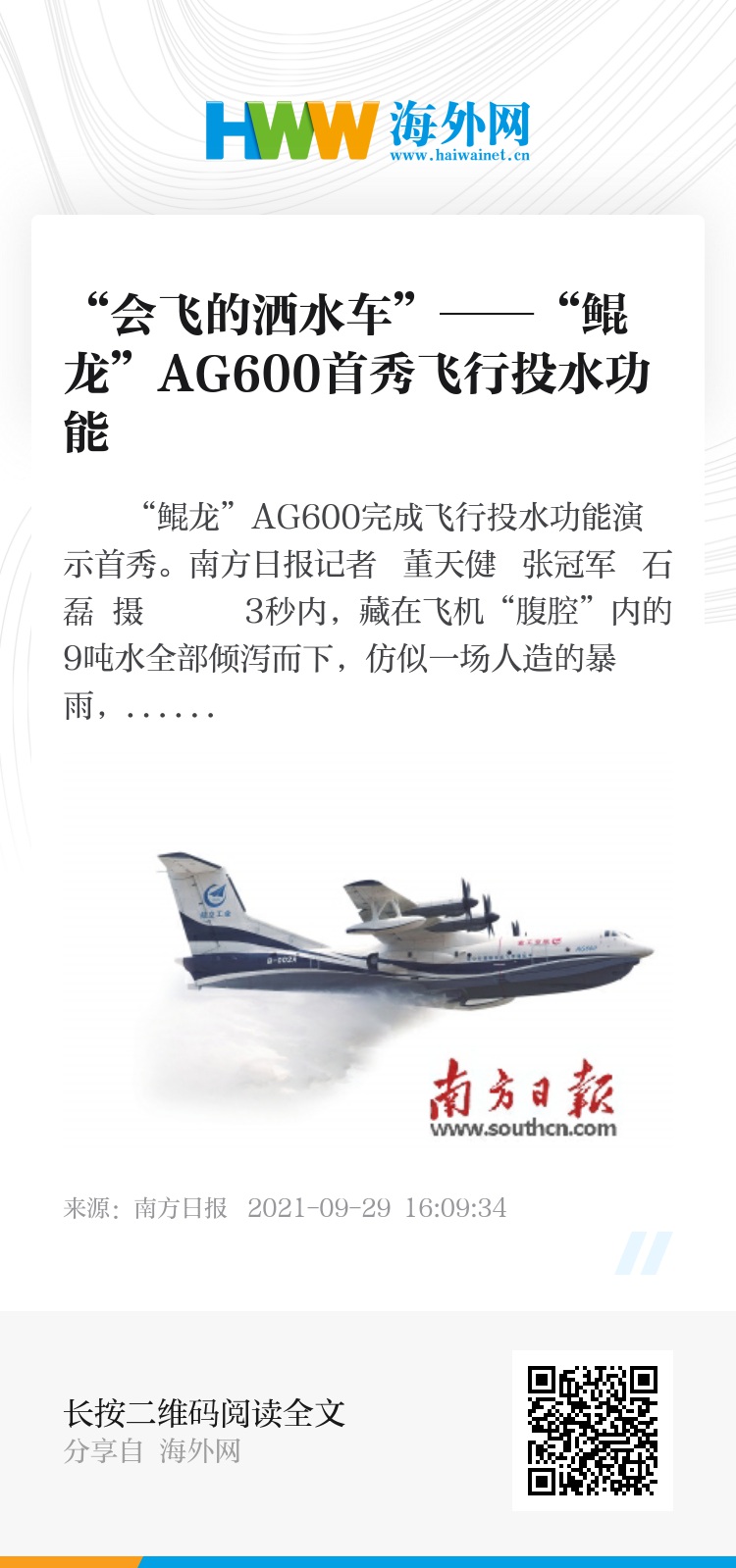 事实上,AG600不仅是“会飞的洒水车”,还是一架“会游泳的飞机”、一艘“能上天的船”,其功能全面,应用场景广泛。这也是为满足森林灭火和水上救援的迫切需要,我国首次研制的大型特种用途民用飞机,属国家应急救援体系和自然灾害防治体系建设急需的重大航空装备。