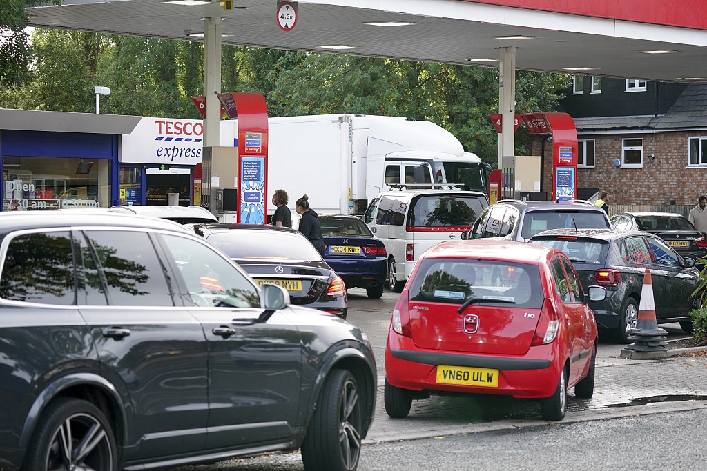 据路透社报道,因卡车司机短缺导致物流运输困难,从而引发供应链危机等问题,英国已有数千家加油站因燃油售空被迫关闭,而民众仍然在各大城市加油站排队购买燃油。图为当地时间9月28日,英国伯明翰,司机在加油站排队加油。图片来源:视觉中国