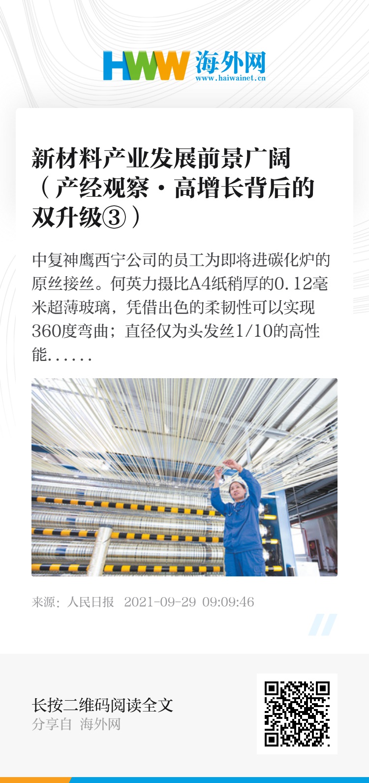 碳纤维产业发展是我国新材料产业蓬勃发展的缩影。“今年以来,我们的新材料业务跑出了‘加速度’,业绩支撑度持续提升,收入和净利润占比分别从去年年底的19%、36%提高到上半年的23%、41%。”中国建材集团董事长周育先说,作为全球最大的综合性建材产业集团、世界领先的新材料开发商,中国建材明显感受到,“十四五”开局以来,高新产业不断壮大,拉动新材料需求增长;新材料持续升级,又拓展更多产业应用。新材料产业正形成需求牵引供给、供给创造需求的更高水平动态平衡。
