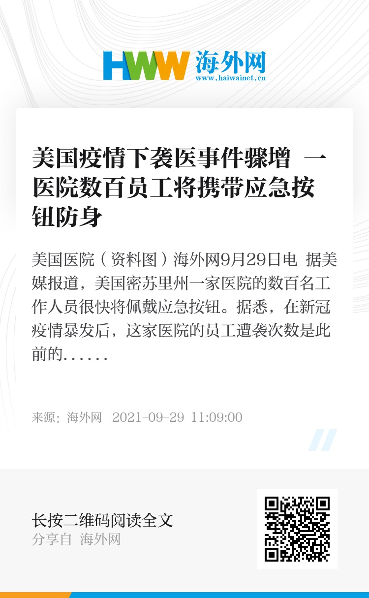 海外网9月29日电 据美媒报道,美国密苏里州一家医院的数百名工作人员很快将佩戴应急按钮。据悉,在新冠疫情暴发后,这家医院的员工遭袭次数是此前的3倍。