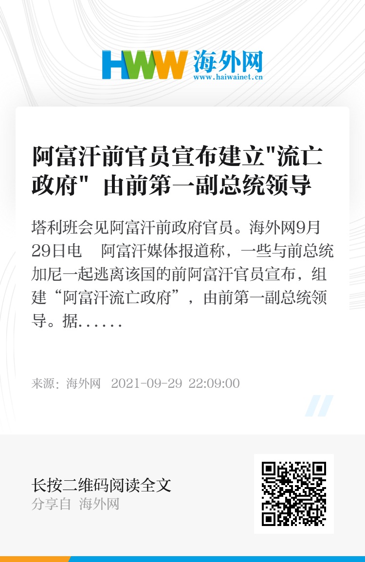 海外网9月29日电 阿富汗媒体报道称,一些与前总统加尼一起逃离该国的前阿富汗官员宣布,组建“阿富汗流亡政府”,由前第一副总统领导。