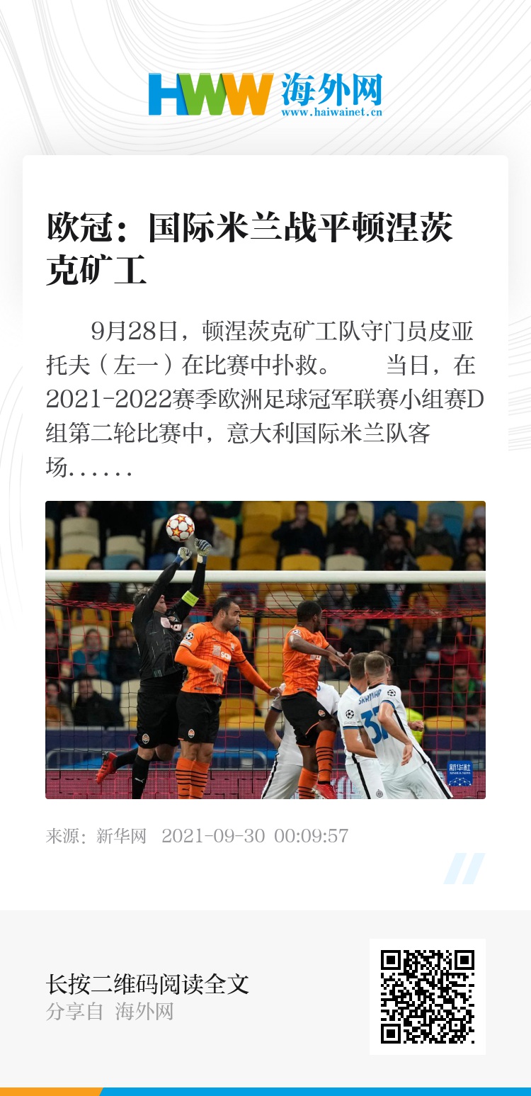 当日,在2021-2022赛季欧洲足球冠军联赛小组赛D组第二轮比赛中,意大利国际米兰队客场以0比0战平乌克兰顿涅茨克矿工队。