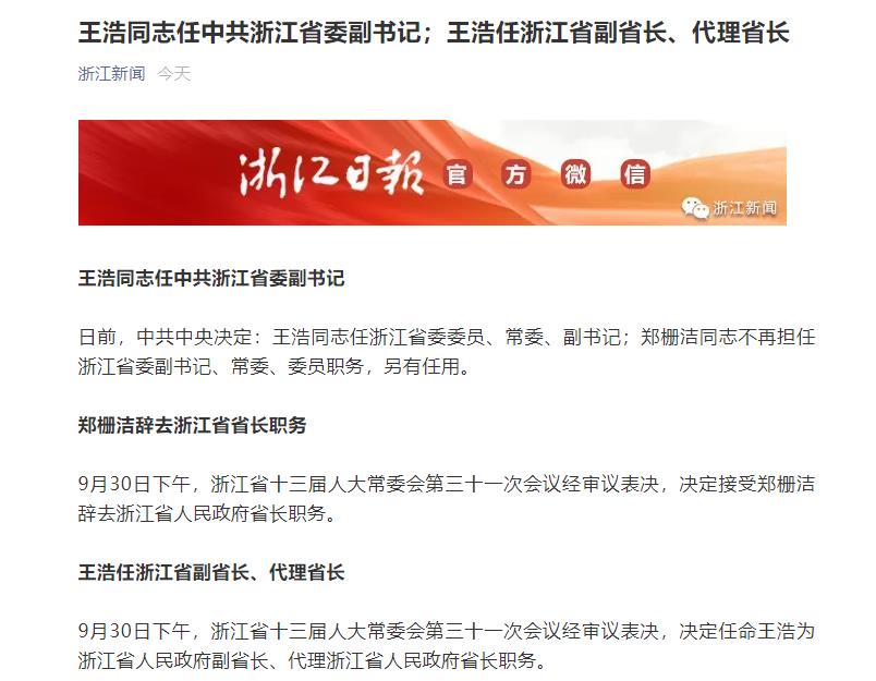 日前,中共中央决定:王浩同志任浙江省委委员、常委、副书记;郑栅洁同志不再担任浙江省委副书记、常委、委员职务,另有任用。
