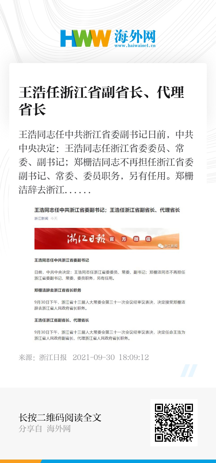 王浩同志任中共浙江省委副书记